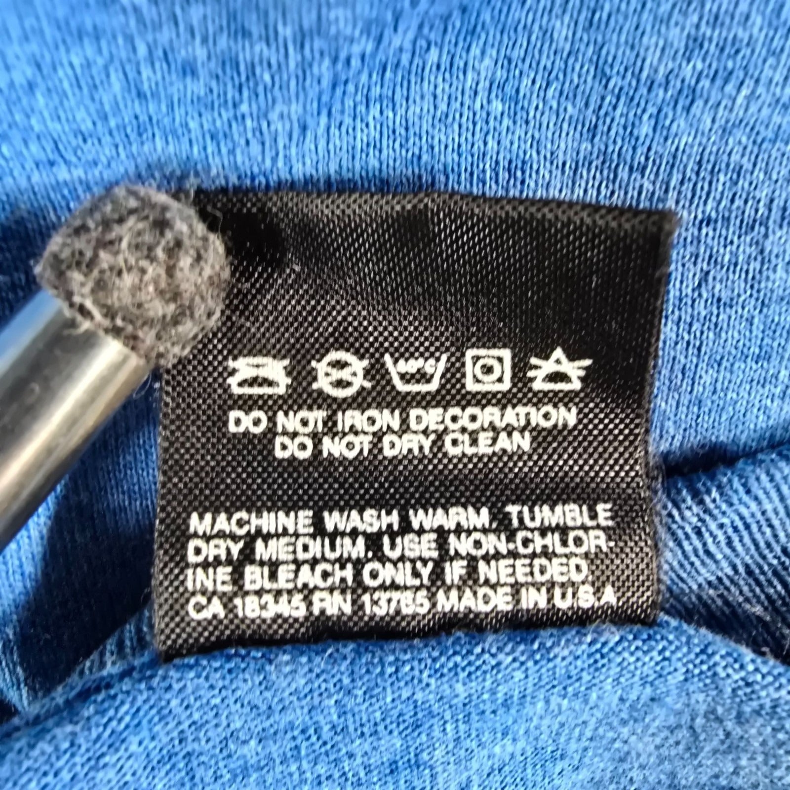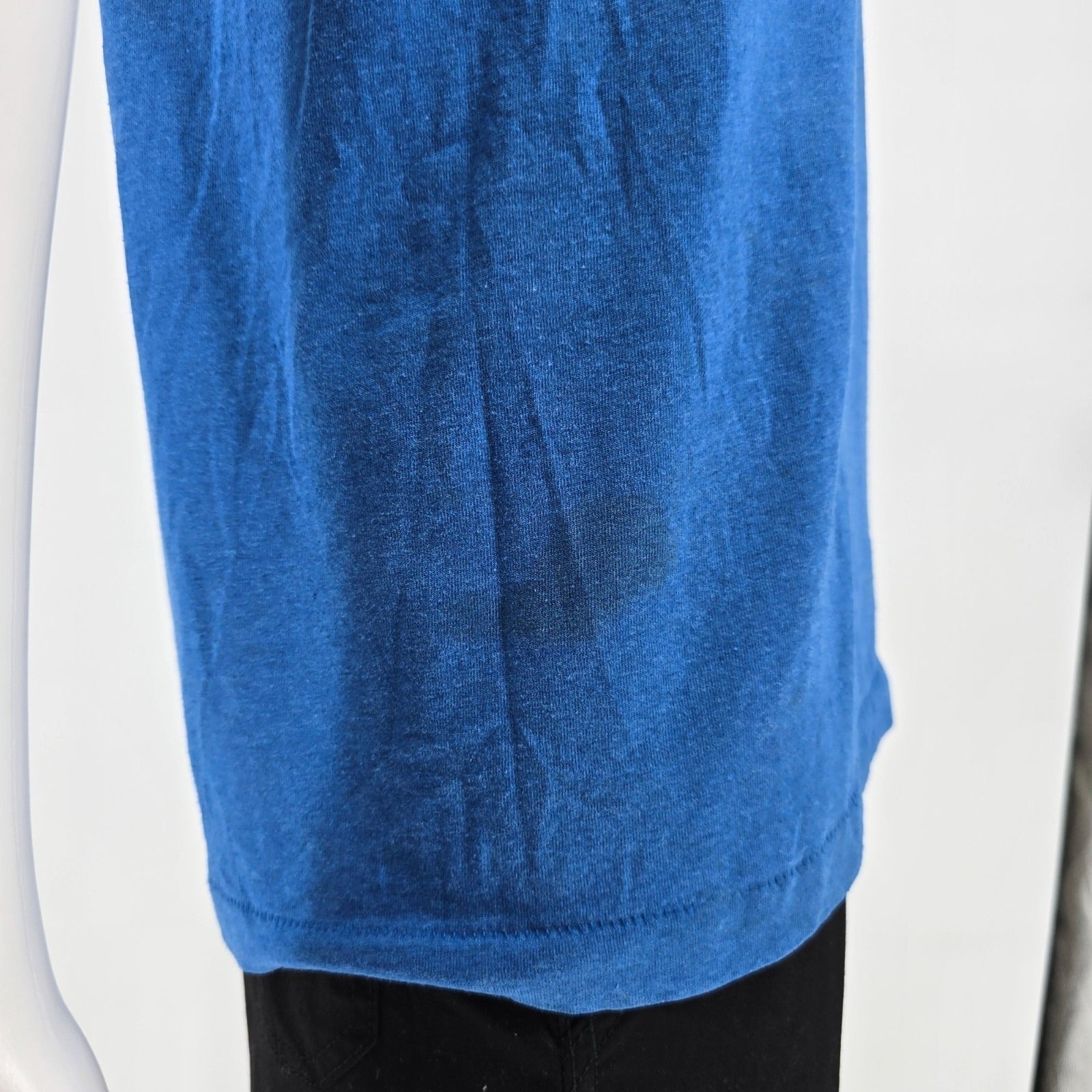 Spots of dark discoloration scattered across the bottom of the shirt between the bottom of the graphic and them.