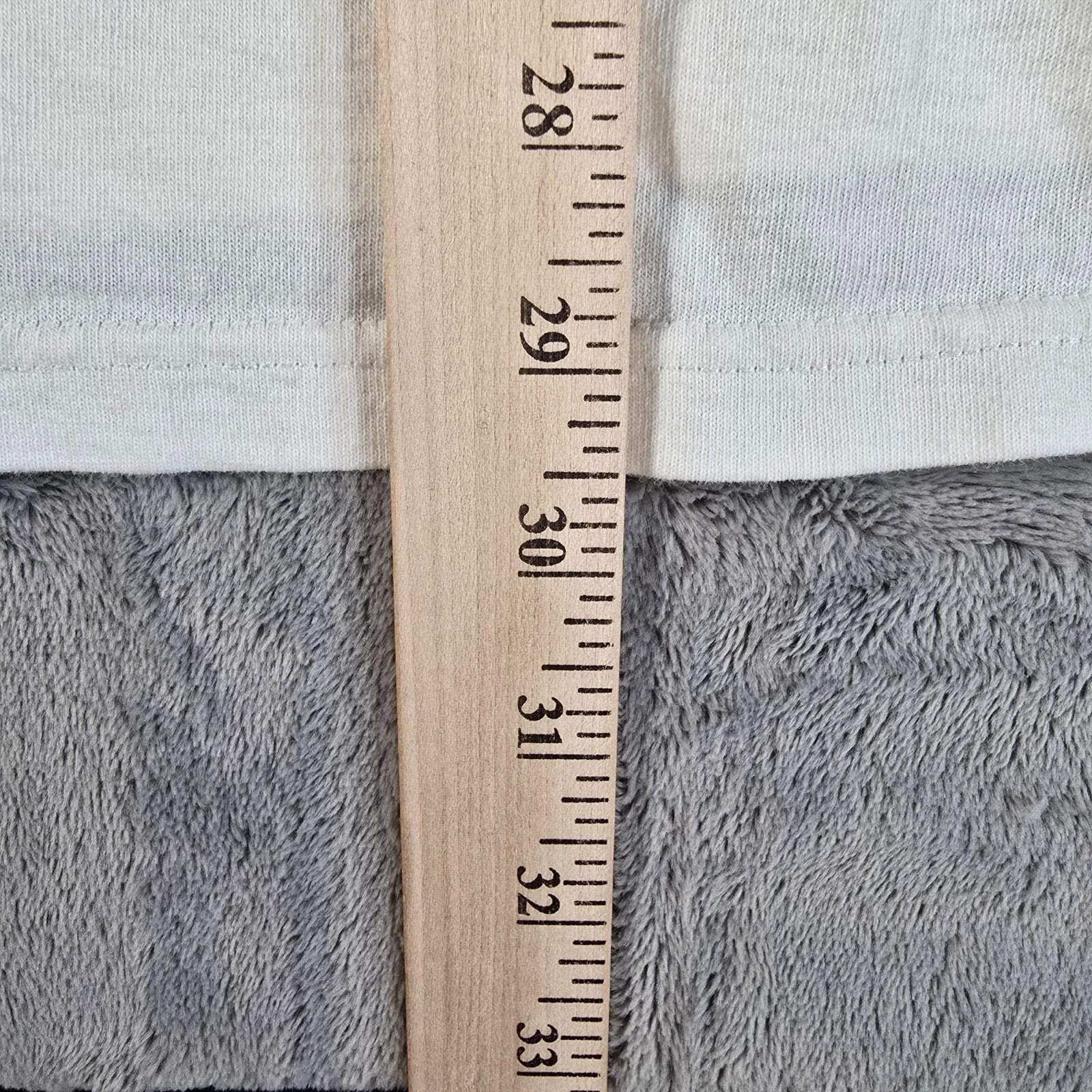 Large spots of faint yellow discoloration/staining scattered throughout (heaviest on back of shirt).