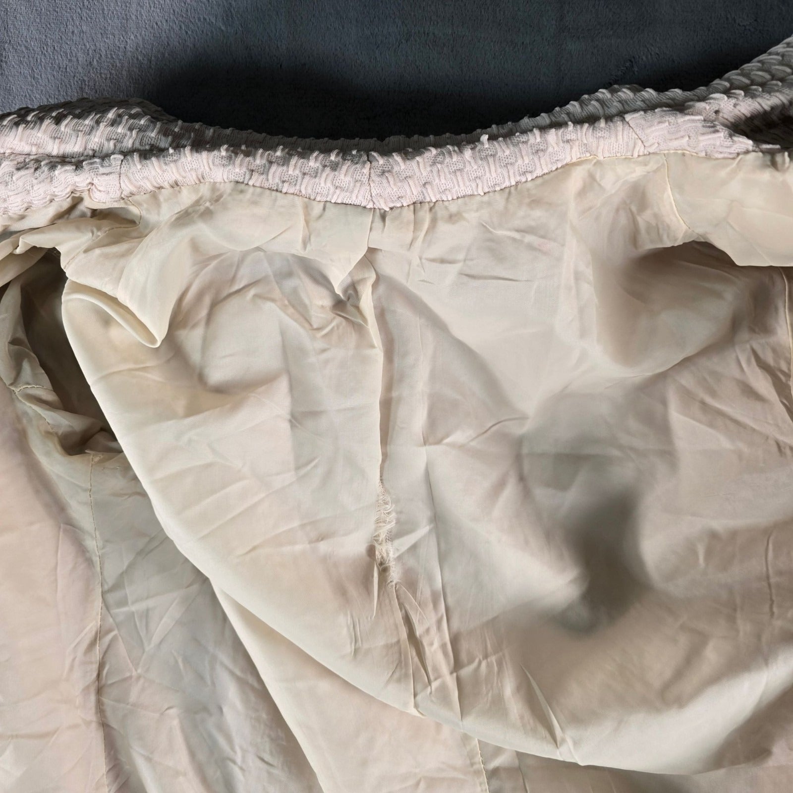 Good used vintage condition. Missing snap button at collar. Tear in inner lining between shoulder blades (not visible when coat is worn). A couple of stains on inner lining (also not visible when coat is worn). Otherwise only light fabric wear throughout. See photos for details.