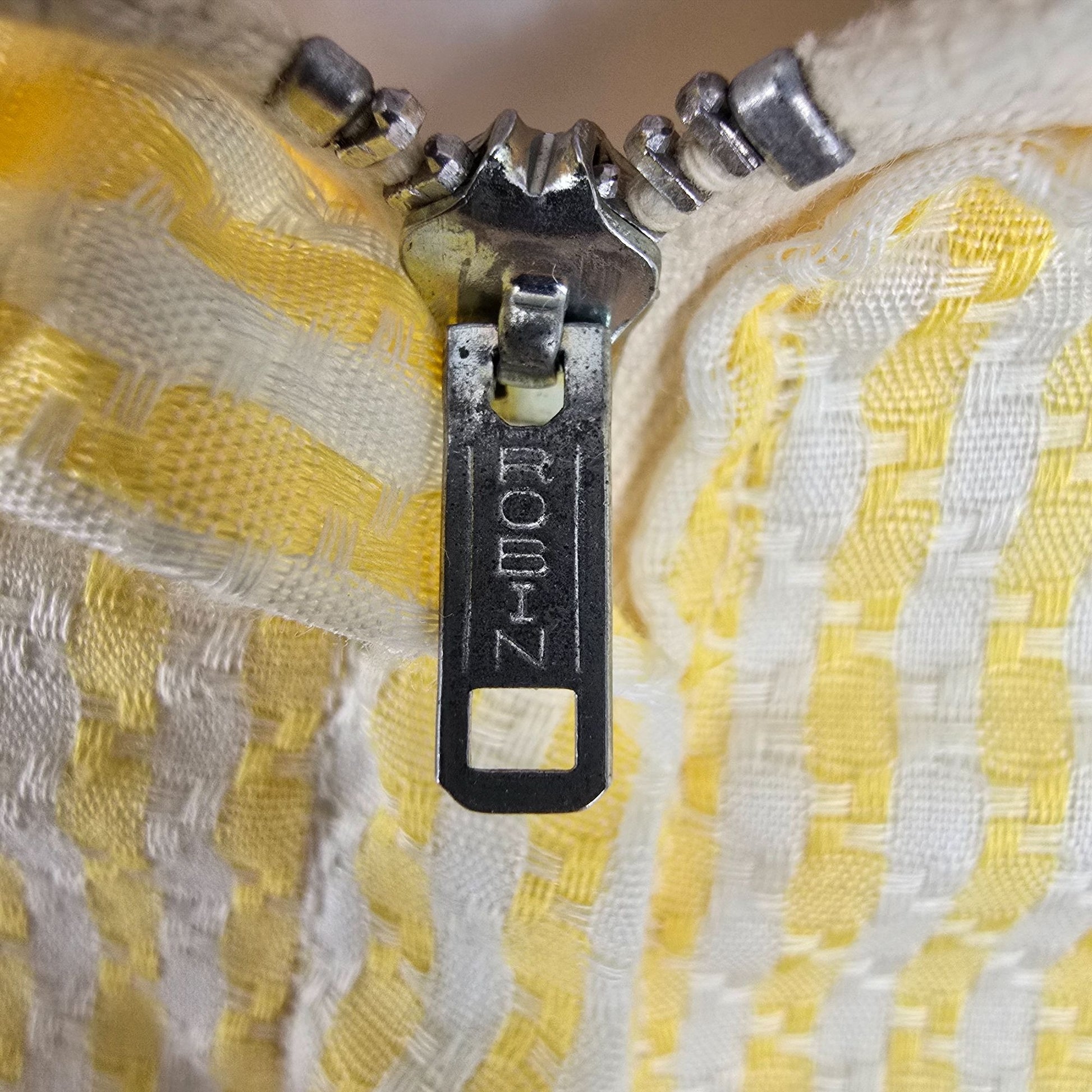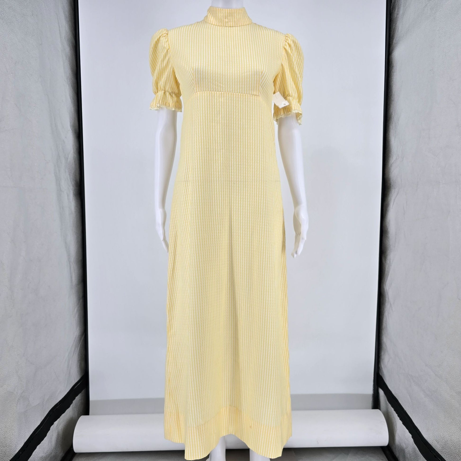 Vintage Early 1970s Yellow/White Striped Puff Sleeve Mock Neck Maxi Dress (S)
