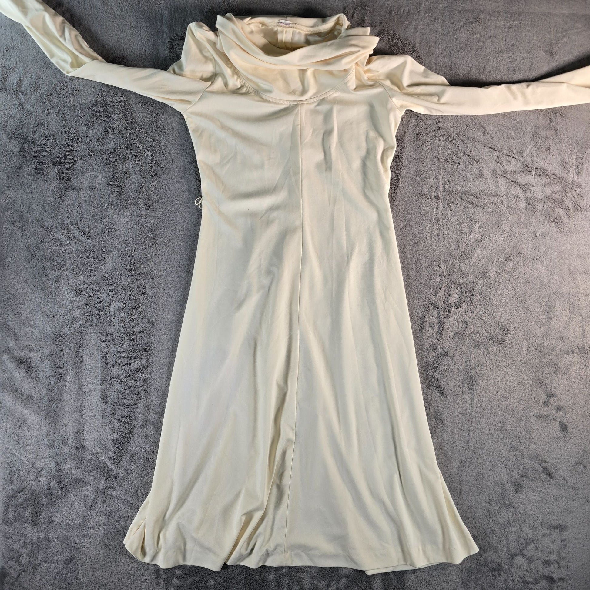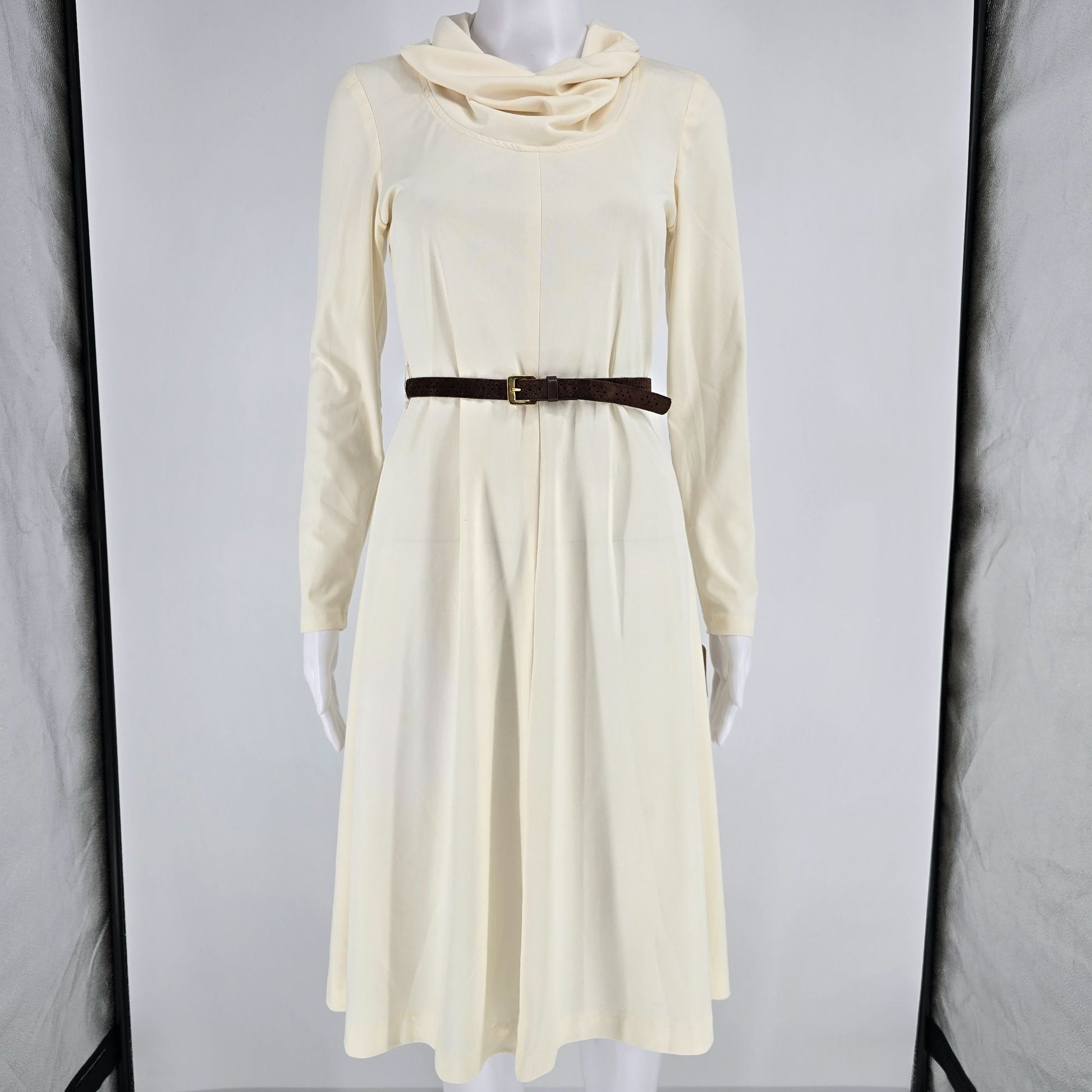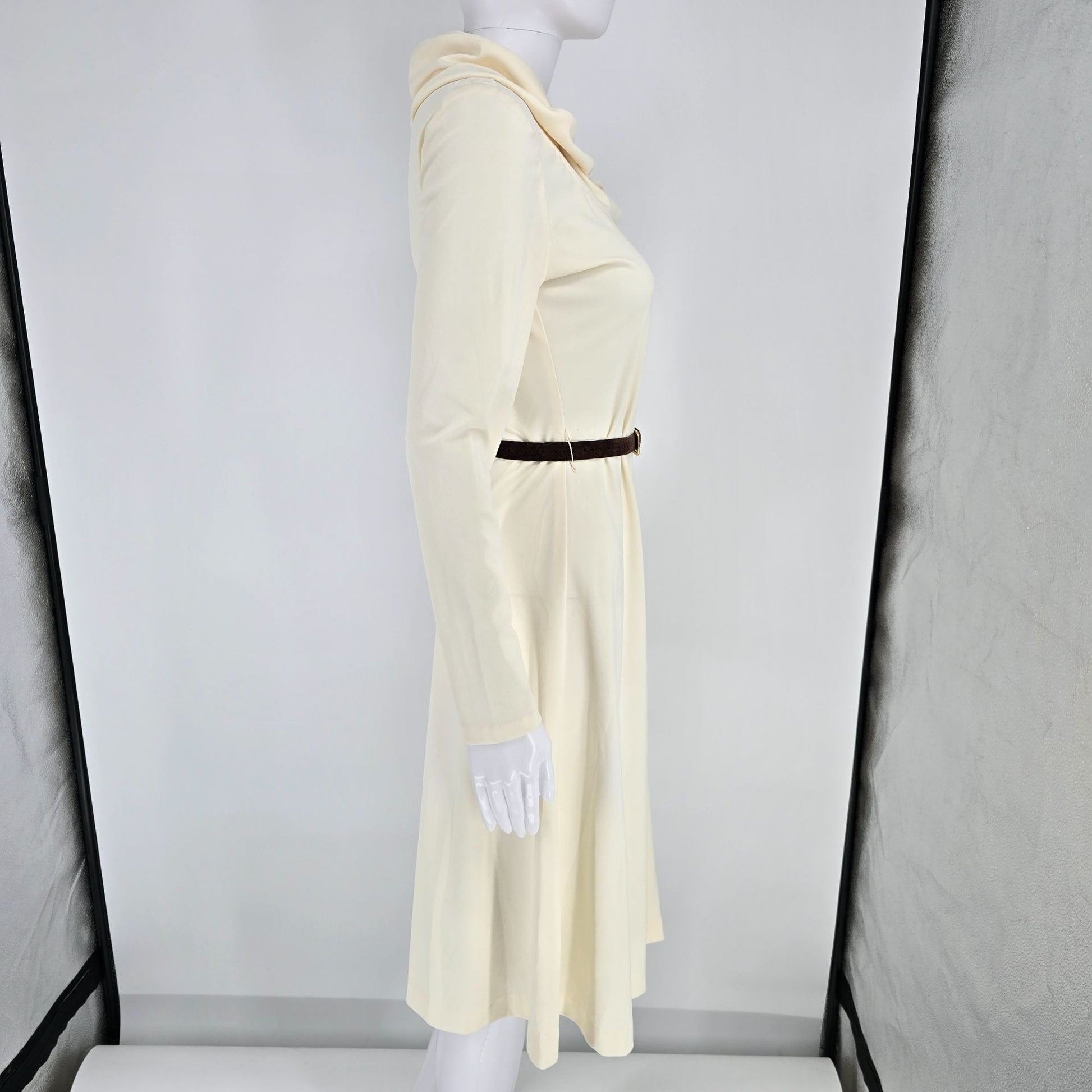 Vintage Late 1960s Cream Cowl Neck Long Sleeve Knit Midi Dress w/ Suede Belt (S)