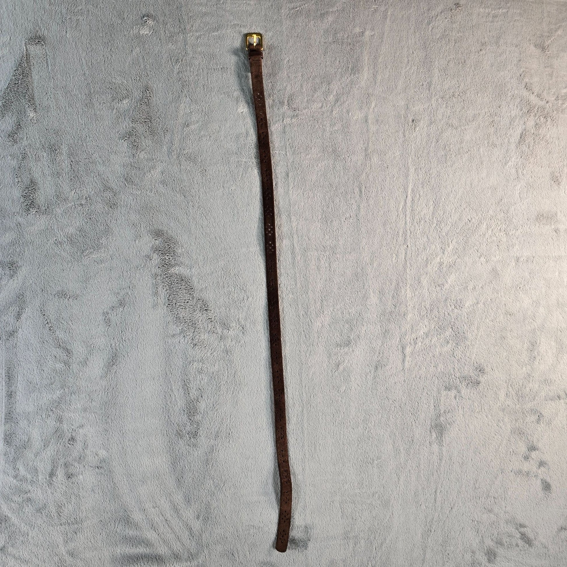 Good overall used vintage condition. One small 0.75" seam split on left side. A few scattered faint markings. Fabric has light to moderate fabric wear throughout. Belt has some creasing and moderate wear throughout. See photos for details.
