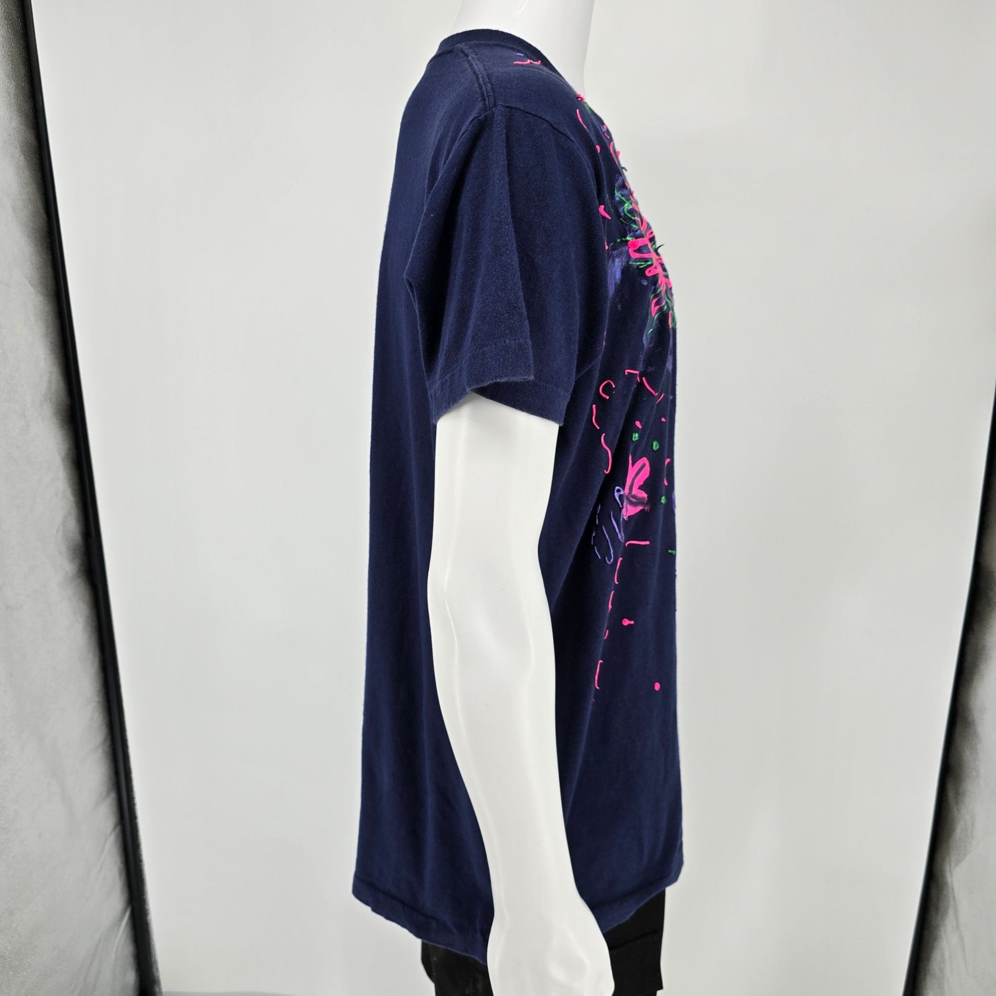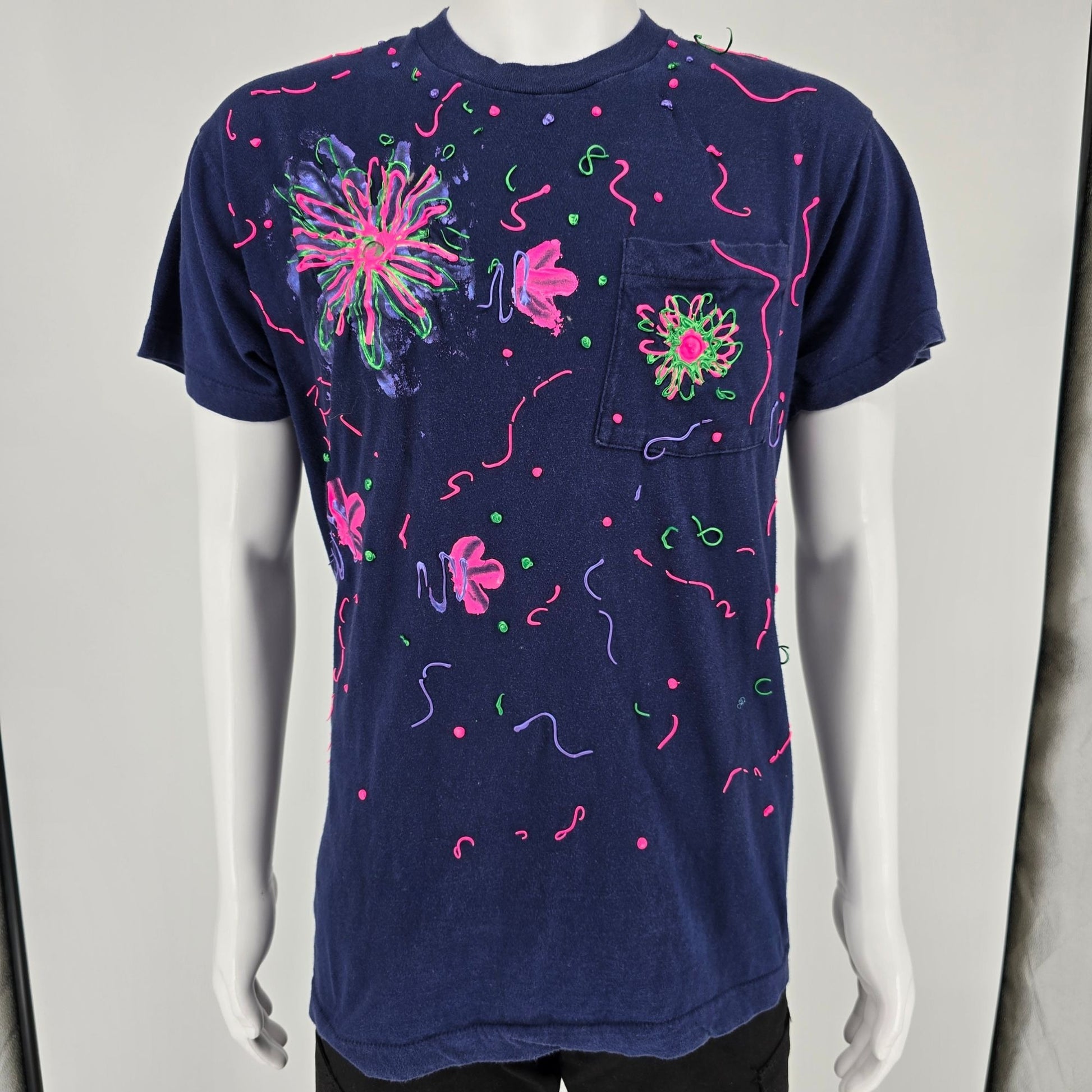 Vintage Late 1980s BVD Abstract Floral Neon Puff Paint Pocket T-Shirt (L/XL)