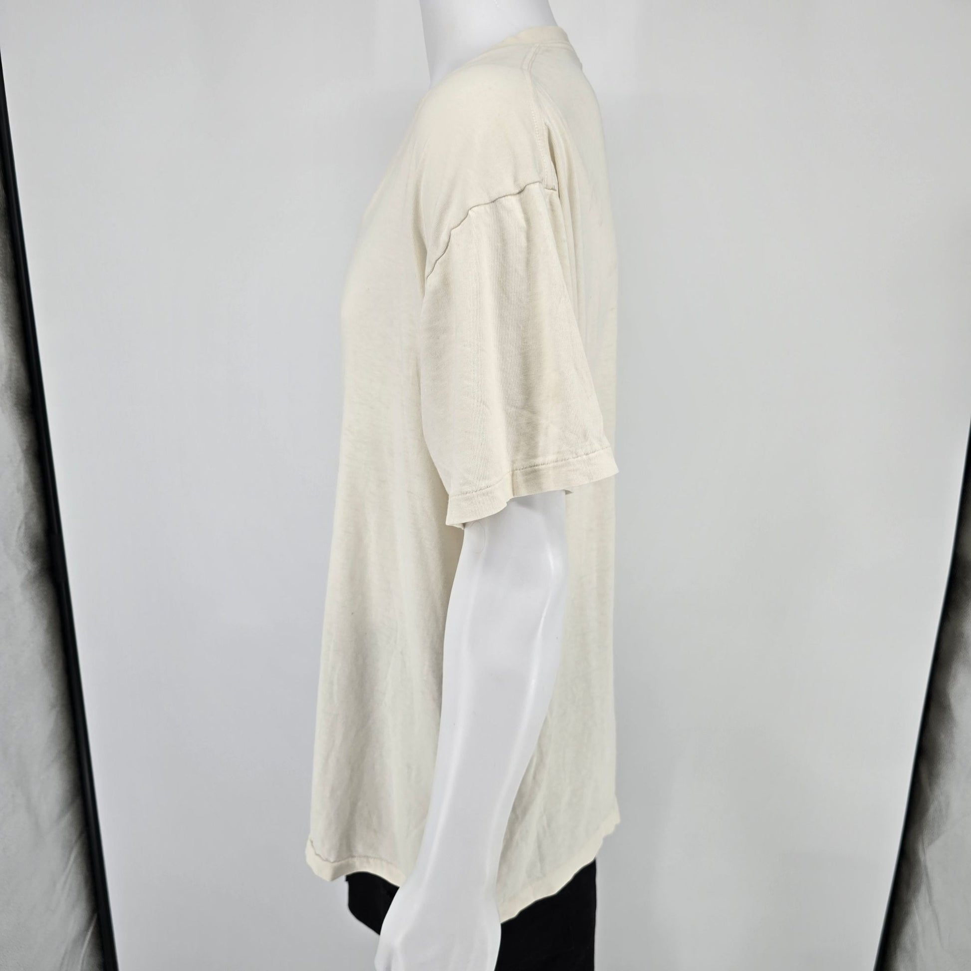 Fair to good used vintage condition. One area of fabric damage on bottom half of front of t-shirt. Stain on back of collar in area of tag. Moderate but uneven discoloration throughout. Overall moderate wear throughout. See photos for details.