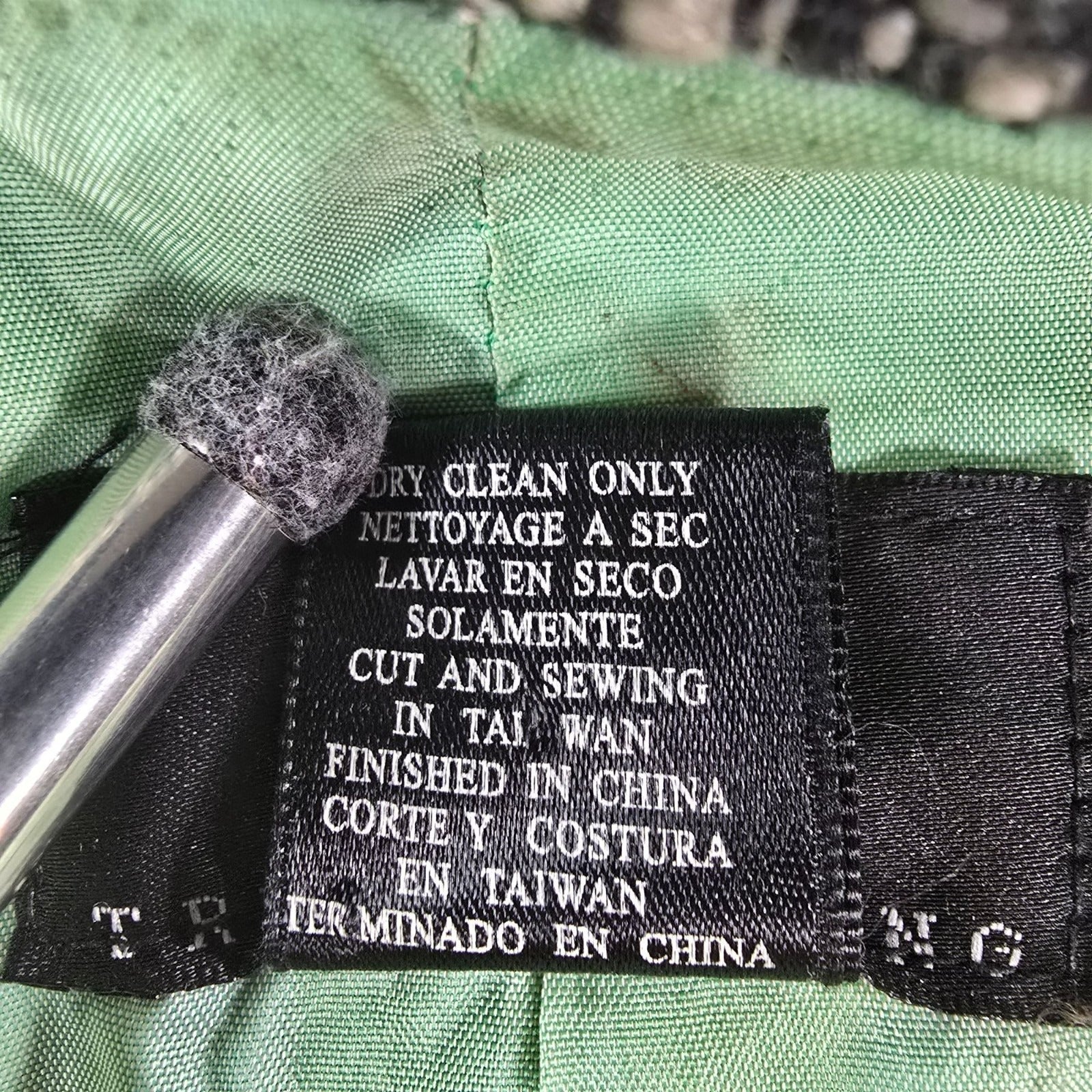 Color: Black/Gray marled bouclé with raw-edge fringe trim; mint green lining