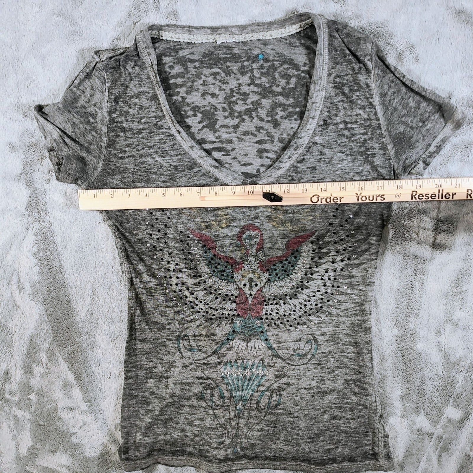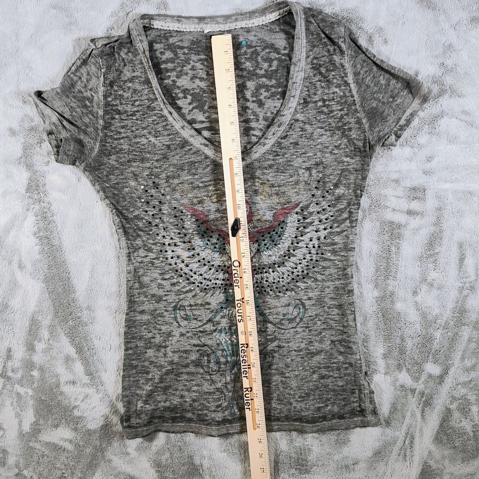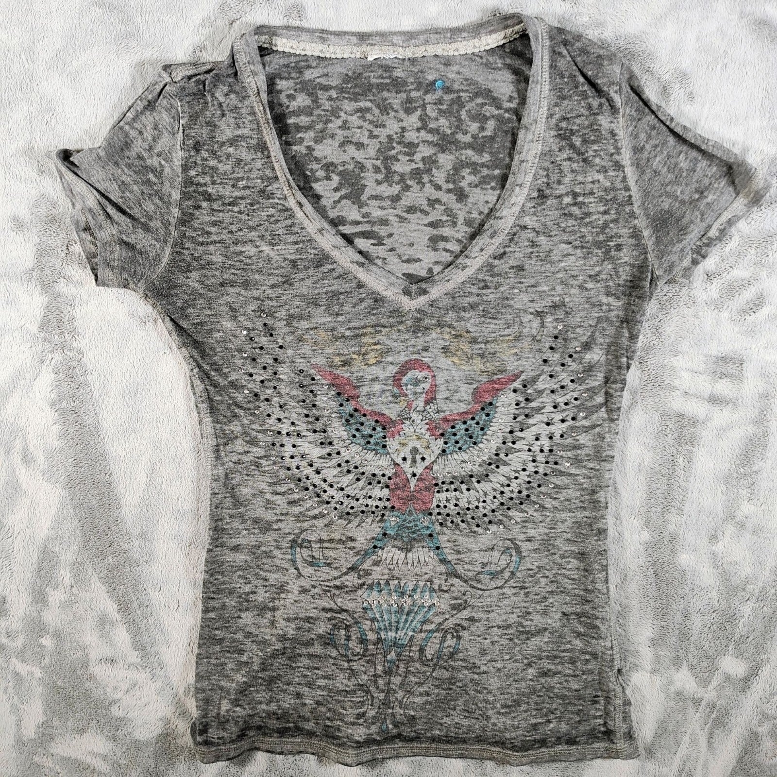 Y2K Aesthetic Crash & Burn Rhinestone Embellished Burnout V-Neck T-Shirt (8/M)