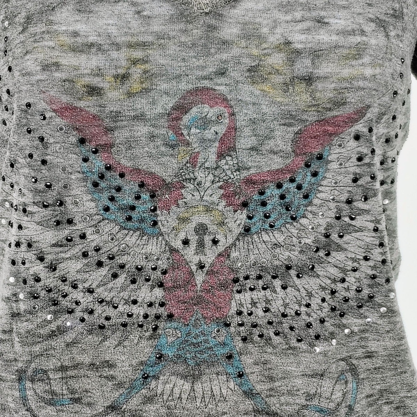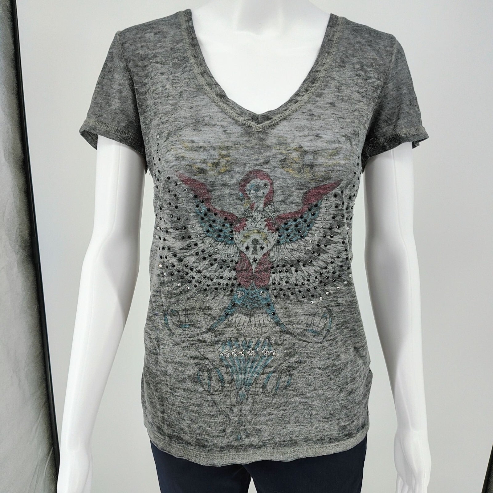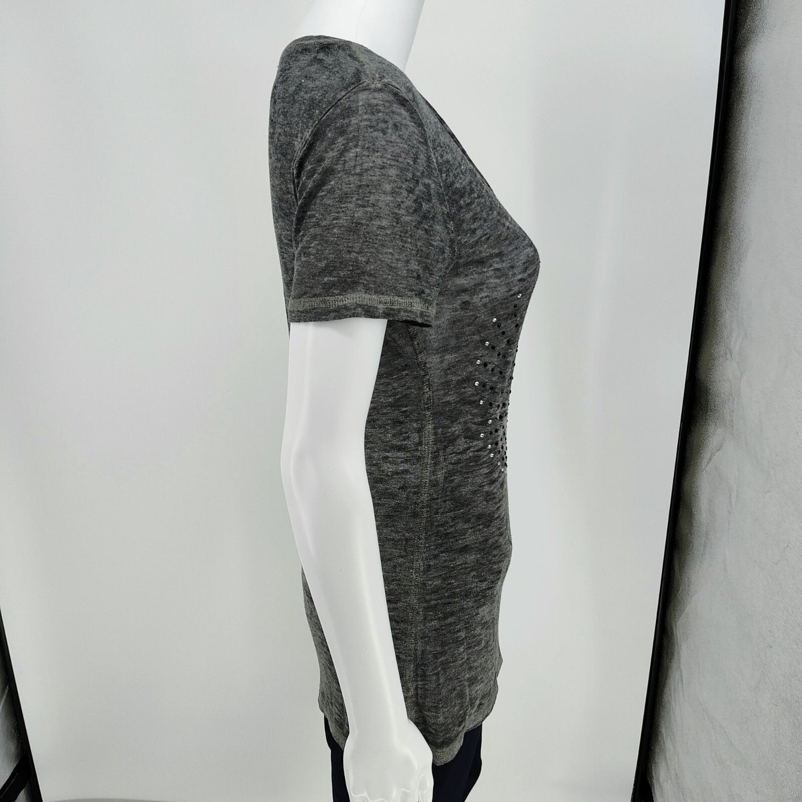 Y2K Aesthetic Crash & Burn Rhinestone Embellished Burnout V-Neck T-Shirt (8/M)