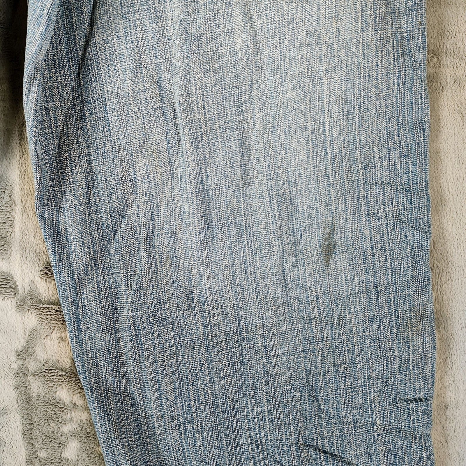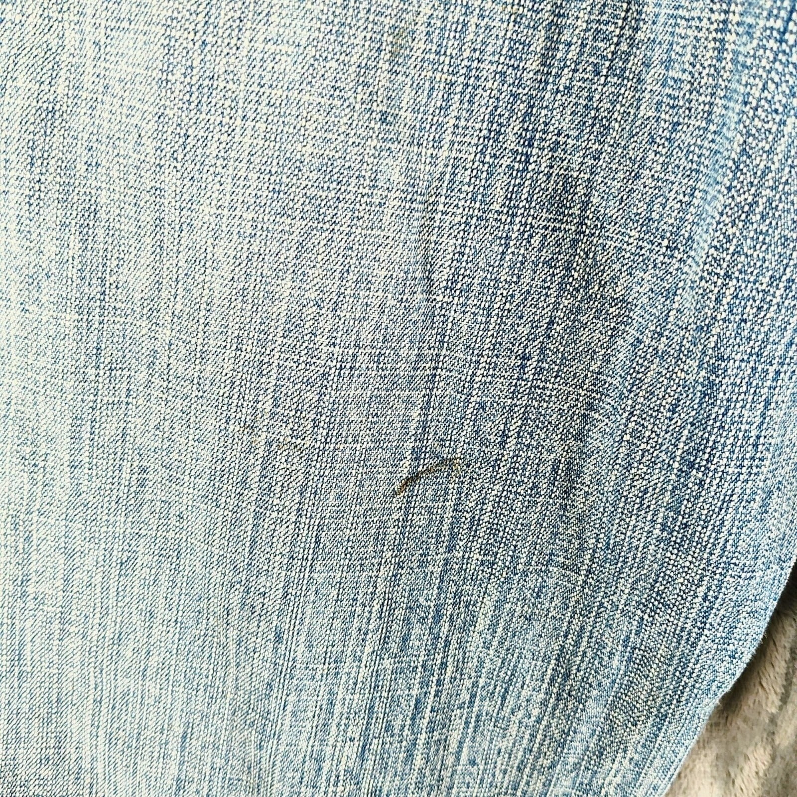 Condition Notes: Fair/distressed vintage condition. Back patch missing. Wear through spot on back just below rightmost belt loop. Repaired hole to the left of the wear through spot. Fraying at hem lines. Dark staining on back of right leg near the top of left leg. Additional spots of discoloration/wear throughout. See photos.